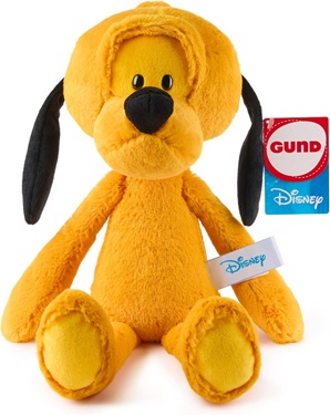 Disney’s Pluto, Mickey’s excitable pet dog, is shown as a soft and huggable plush with authentic character details from Mickey & Friends, including his bright orange-yellow plush complemented by his long, floppy black ears, a pointed black nose on a happy muzzle, and a matching black tail.