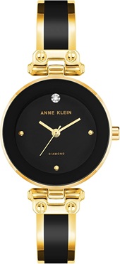 Stainless steel case. Bracelet with jewelry clasp closure. Round face. Three-hand analog display with quartz movement. Hands and hour markers, diamond accent, and Anne Klein detailing. Enamel detailing on bezel. Display case included. Imported.