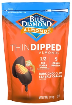 Blue Diamond branded oven-roasted almonds, with no added oil. Then carefully dipped in a thin layer of high-quality dark chocolate and sea salt caramel. A simple, all-natural sweet snack, with half the sugar and 5 grams of protein per serving.