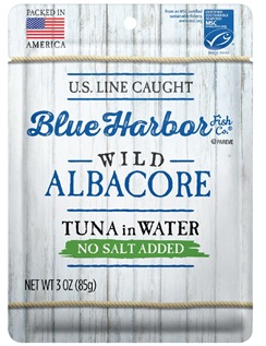 Blue Harbor Fish Co. Wild Albacore Tuna in Water No Salt Added is simply prepared with hand selected, firm, meaty cuts of albacore tuna and no added salt. This tuna pouch provides a delicious, mild, clean flavor with 150mg of total sodium – and no draining required.