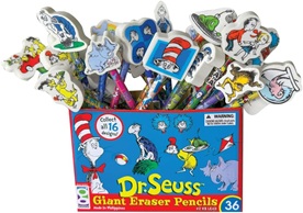 Dr. Seuss giant eraser pencils include matching pencil barrels. Assortment contains characters from four of Dr. Seuss’ most welled loved books. #2 lead.