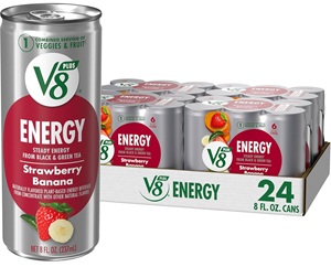 Experience a delicious plant-powered energy boost with V8 +Energy Strawberry Banana Juice Energy Drink. Combining the flavors of sweet strawberry and creamy banana, this concentrated fruit and vegetable juice blend is infused with natural energy from black and green tea.