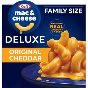 Serve everyone in the family a bowl of comfort with Kraft Deluxe Original Cheddar Macaroni & Cheese Dinner Family Size Box. Rich and creamy, our dinner is made with ridge macaroni and real cheese sauce.