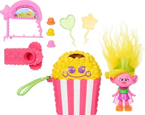 Ready for on-the-go fun, this DreamWorks Trolls Fun Fair Surprise FairFest playsets includes Viva small doll, a mini game, and 10 accessories! Kids open the popcorn-themed character to set up a Fun Fair Popcorn Hole game booth and play out the action.