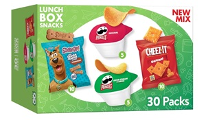 Variety pack includes Cheez-It Original, Pringles Original, Pringles Sour Cream and Onion, and SCOOBY-DOO! Cinnamon snacks