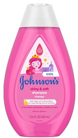 13.6-fluid ounce bottle of Johnson’s Kids Shiny & Soft Shampoo for Kids and Toddlers to boost natural shine. It gently cleanses toddler’s delicate hair and promotes long-lasting shine